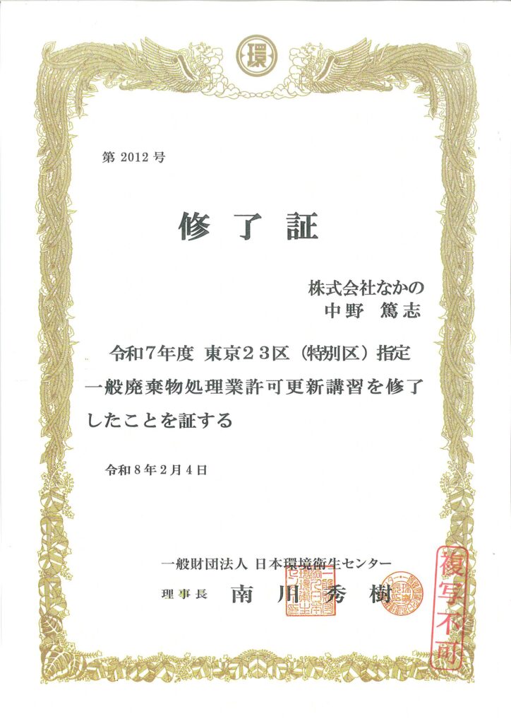 お知らせNews当社からのお知らせをご案内します。TOPお知らせ一覧東京23区指定一般廃棄物処理業の講習修了証を更新いたしました。 2026年2月4日東京23区指定一般廃棄物処理業の講習修了証を更新いたしました。一般廃棄物処理業の許可更新の講習修了証を更新しました。新規修了証をホームページに掲載しましたので、下記URLよりダウンロードし、ご活用下さい。 一般廃棄物 修了証最近のお知らせ東京23区指定一般廃棄物処理業の講習修了証を更新いたしました。2025年12月度 ペットボトルキャップ受入実績新年のご挨拶年末のご挨拶正しい排出をお願いします。アーカイブ2026 (3)2025 (41)2024 (36)2023 (36)2022 (13)« 前へ一覧へ