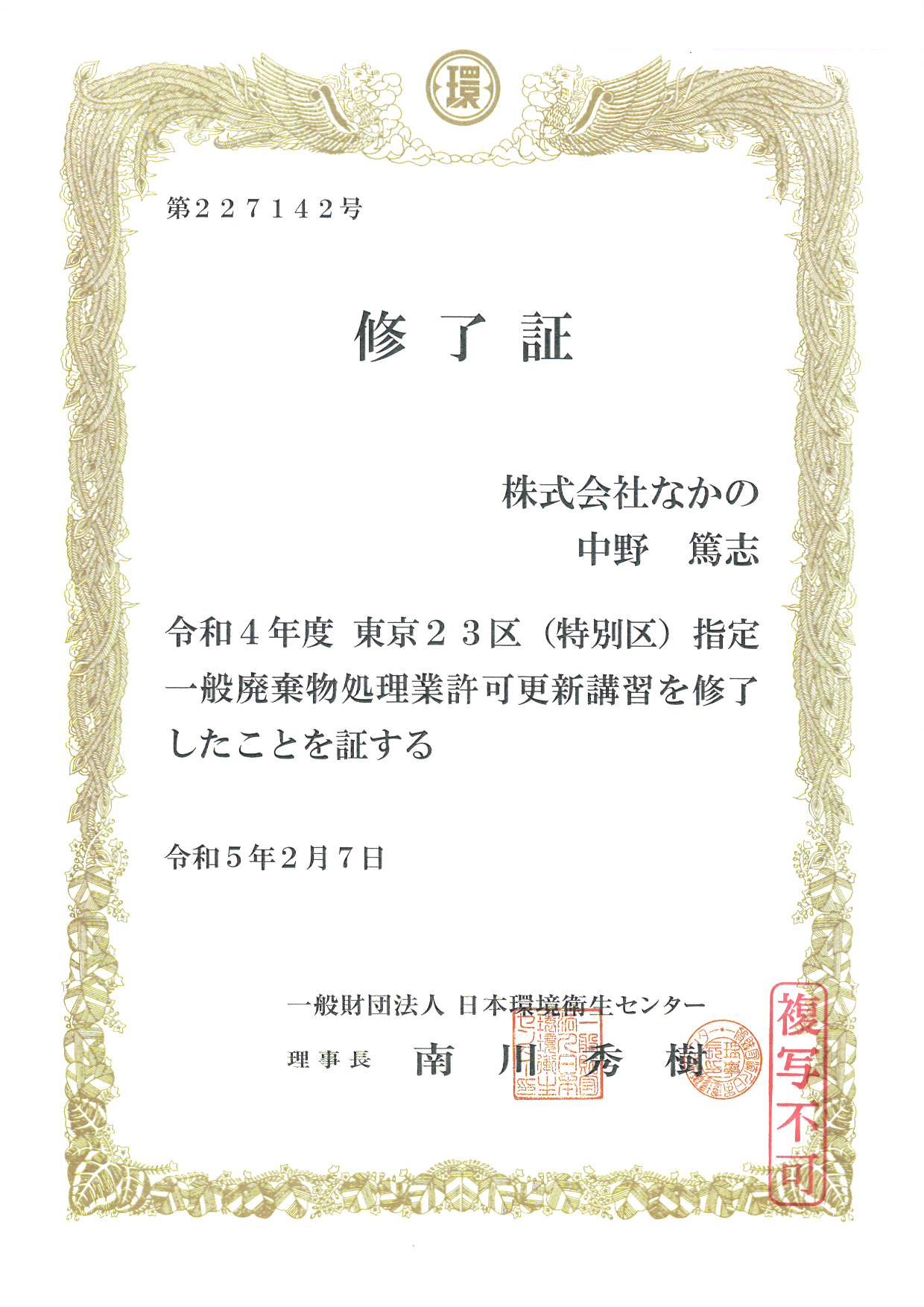 お知らせNews当社からのお知らせをご案内します。TOPお知らせ一覧東京23区指定一般廃棄物処理業の講習修了証を更新致しました。 2023年2月14日東京23区指定一般廃棄物処理業の講習修了証を更新致しました。一般廃棄物処理業の許可更新の講習修了証を更新しました。新規修了証をホームページに掲載しましたので、下記URLよりダウンロードし、ご活用下さい。4b6e64aac4c055ac595f8346dbbca765.pdf最近のお知らせ東京23区指定一般廃棄物処理業の講習修了証を更新いたしました。2025年12月度 ペットボトルキャップ受入実績新年のご挨拶年末のご挨拶正しい排出をお願いします。アーカイブ2026 (3)2025 (41)2024 (36)2023 (36)2022 (13)« 前へ一覧へ次へ »
