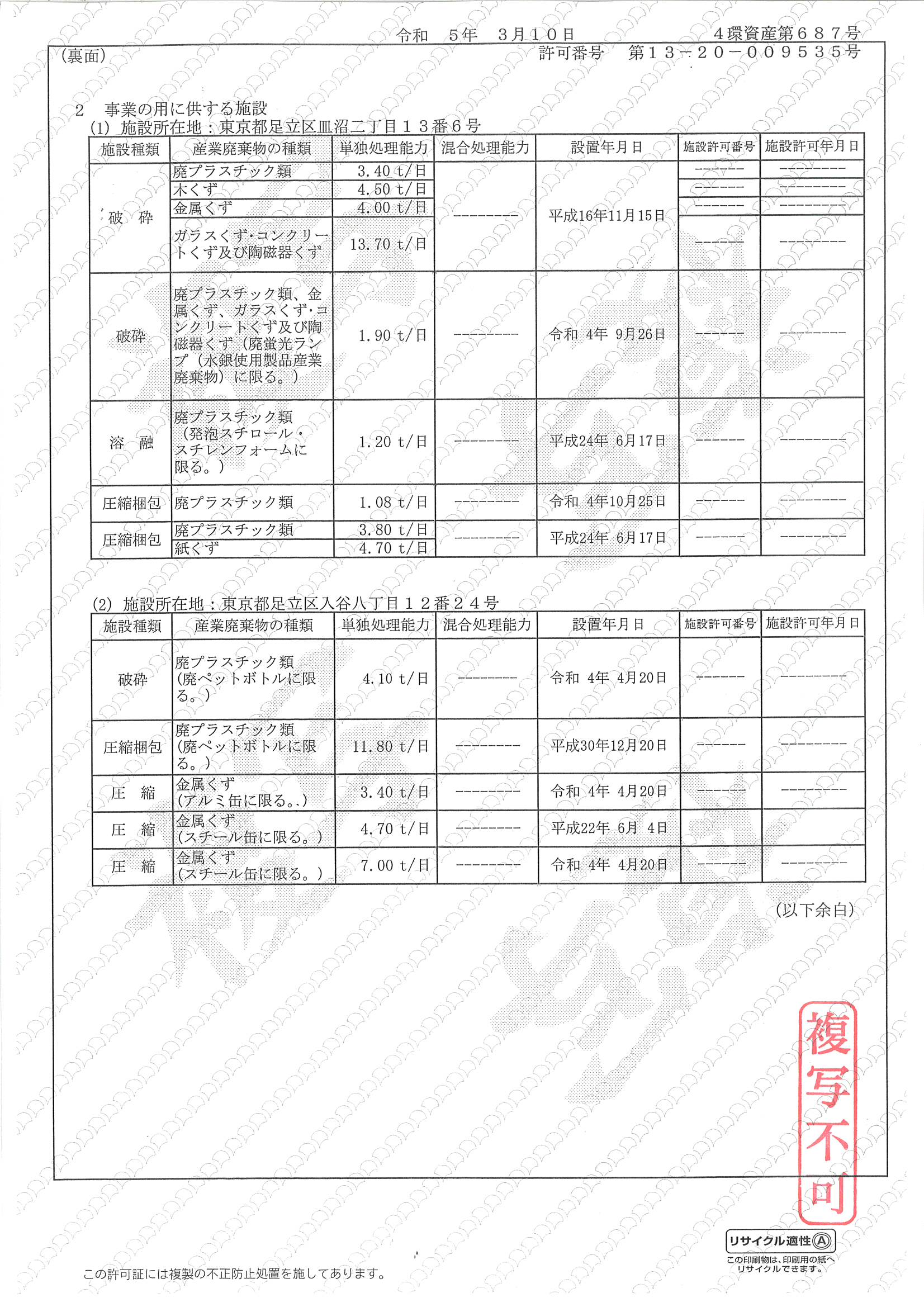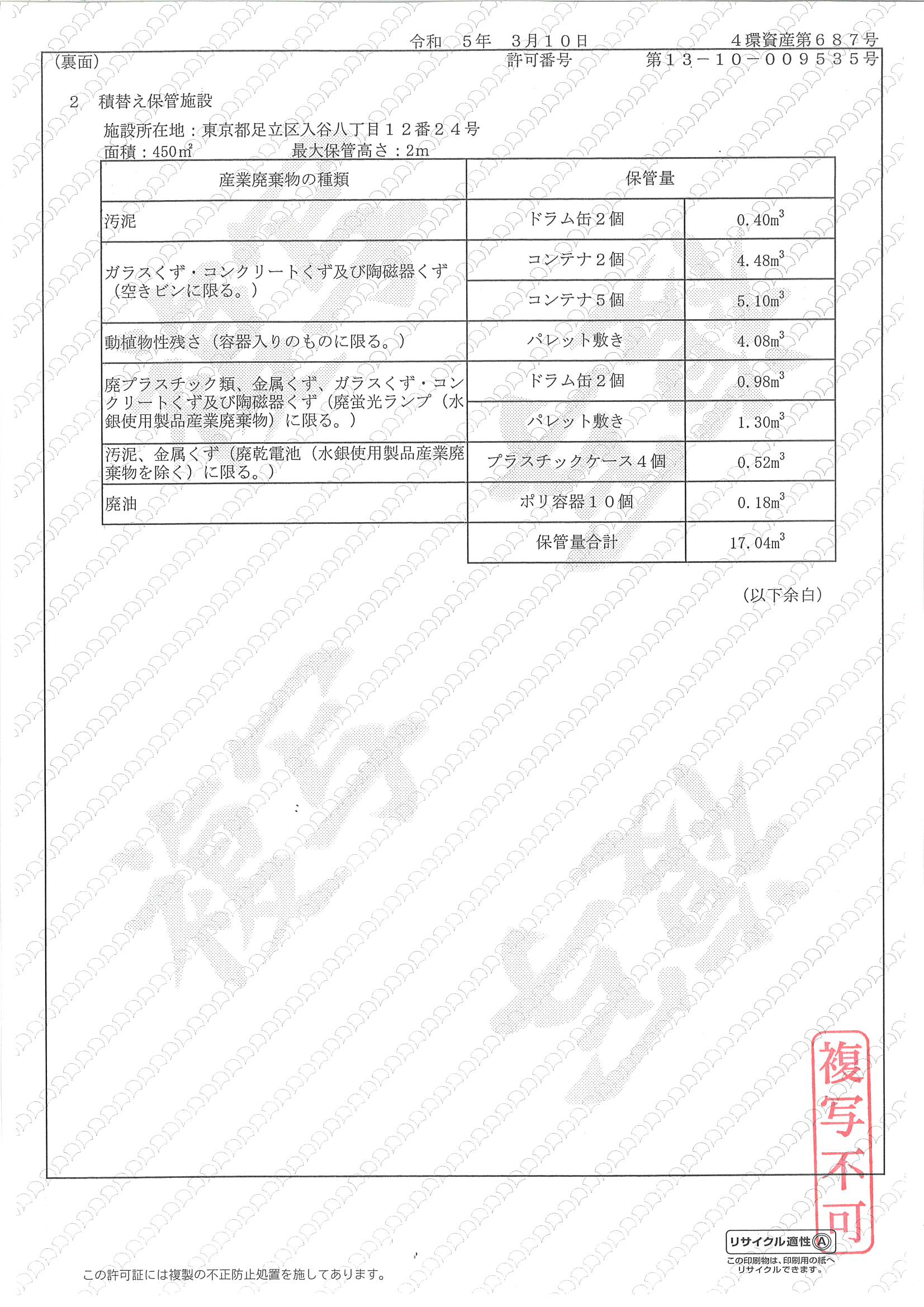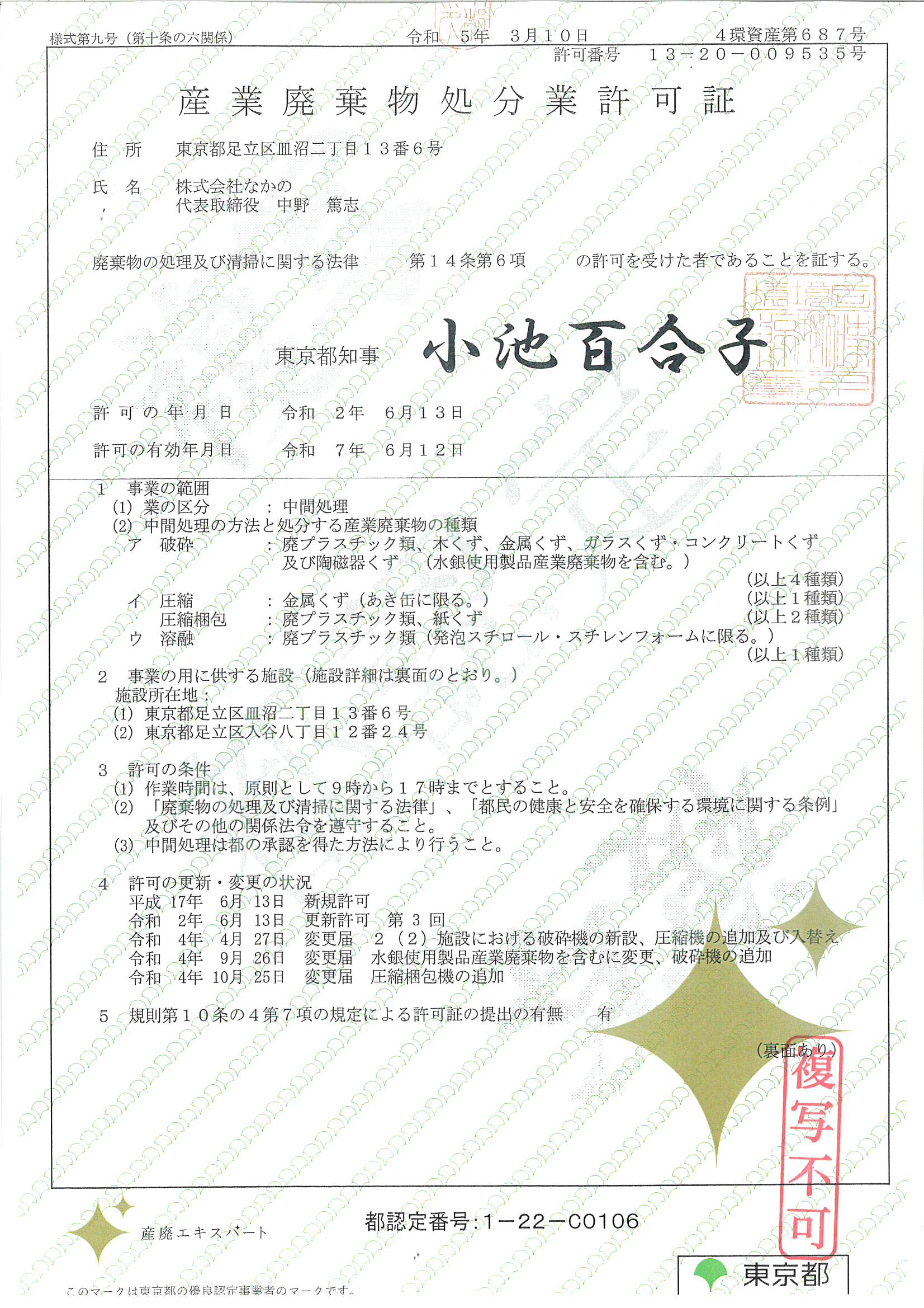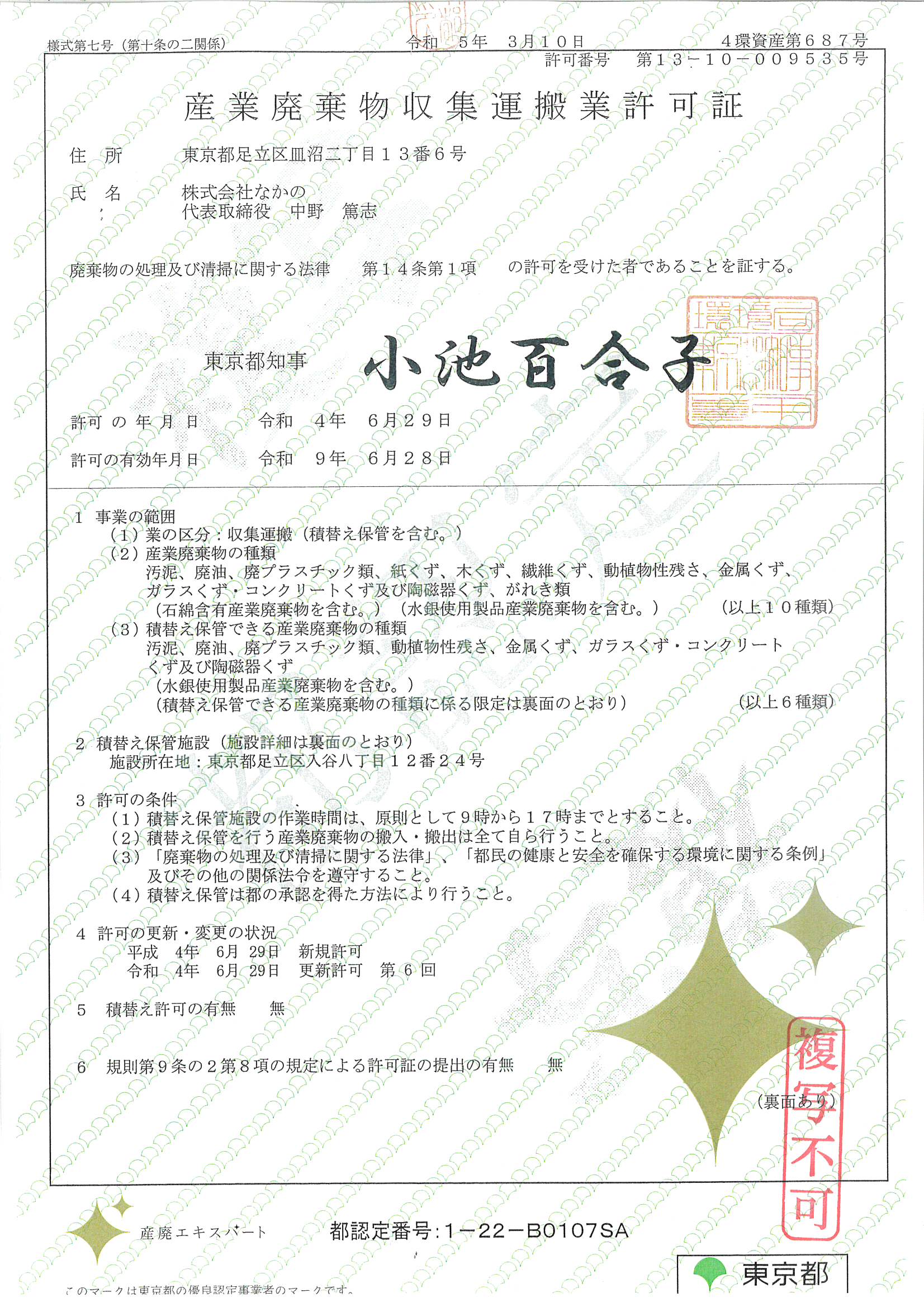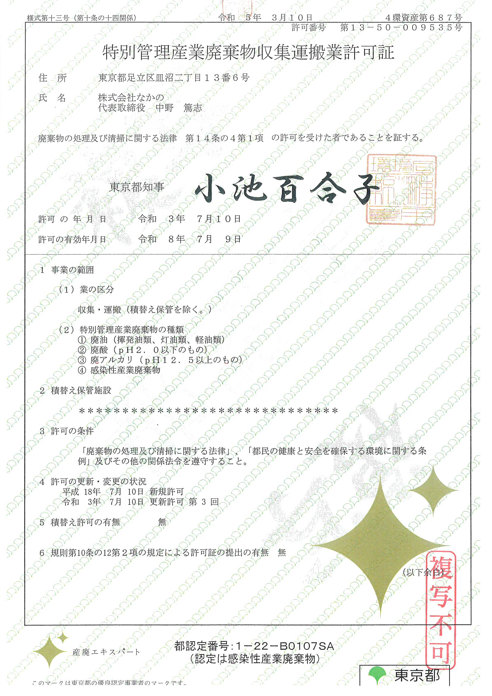 東京都の許可証に産廃エキスパートのマークを入れて頂きました。